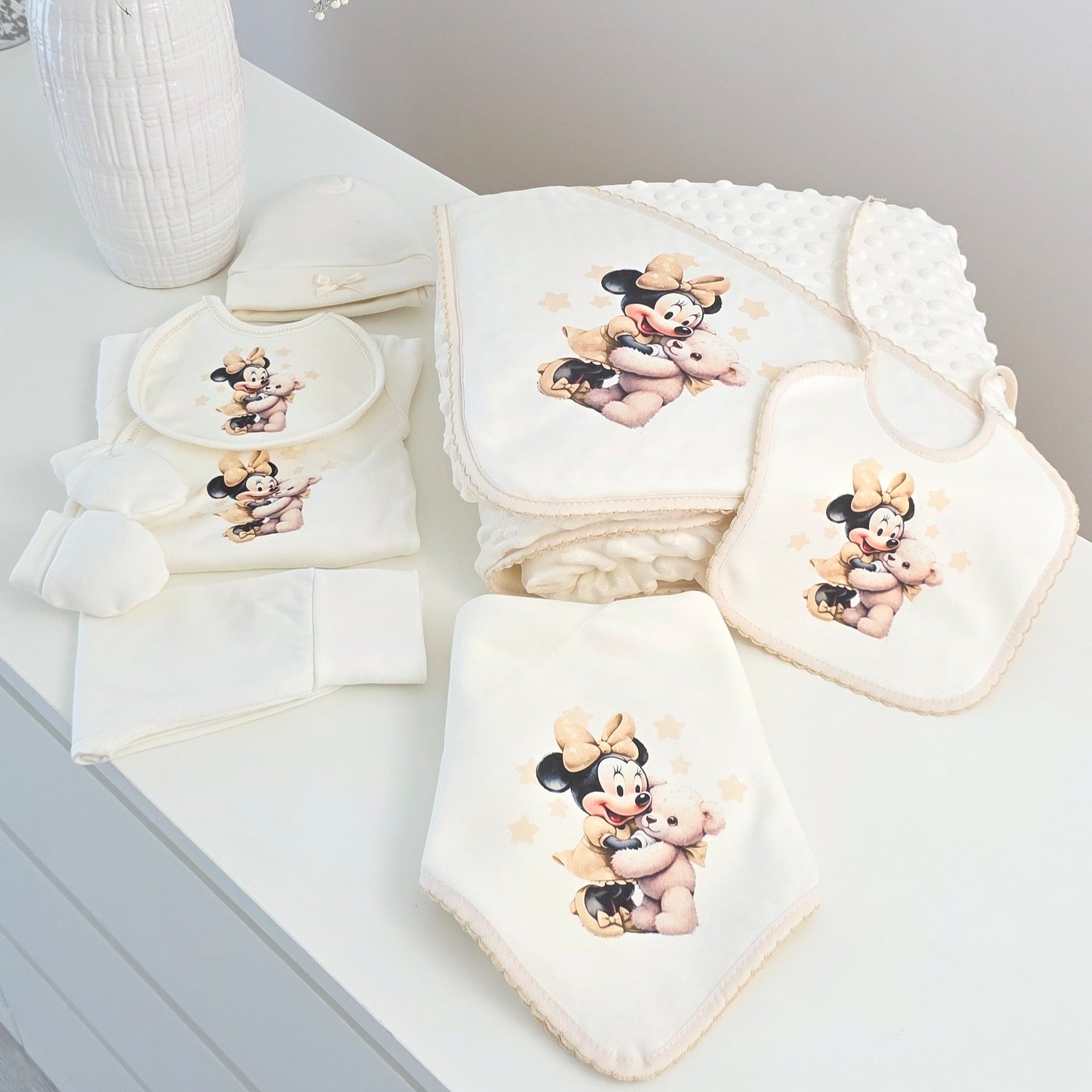 Conjunto mantinha, Babete, Fralda de Pano, Toalha de Banho, Body, Calças, Babete redondo, Luvas, Gorro