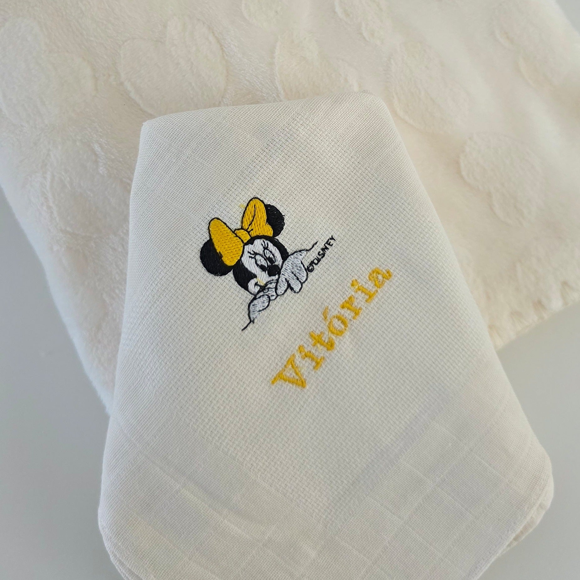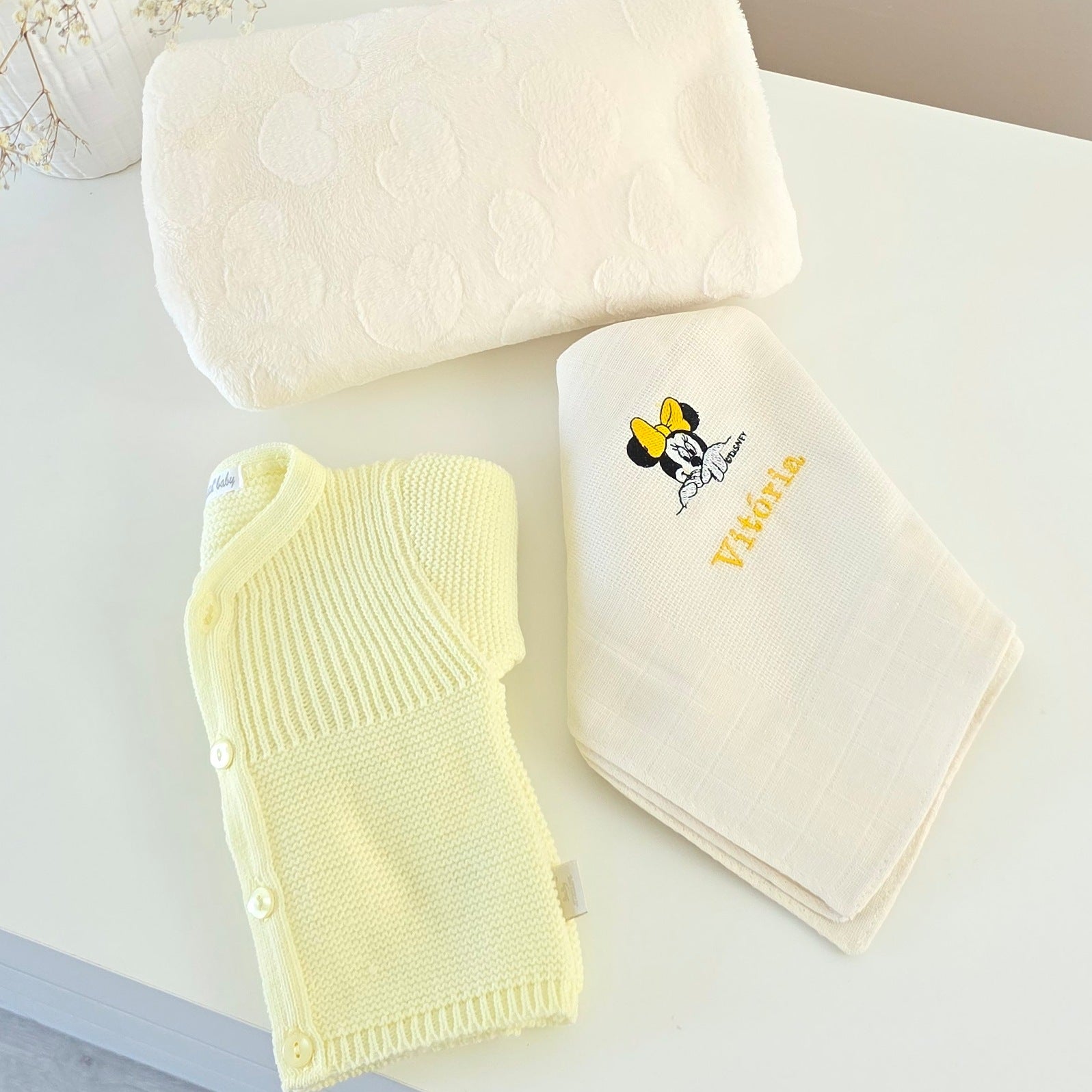 Conjunto mantinha, casaco de malha, fralda de pano bordada com nome vitória e desenho