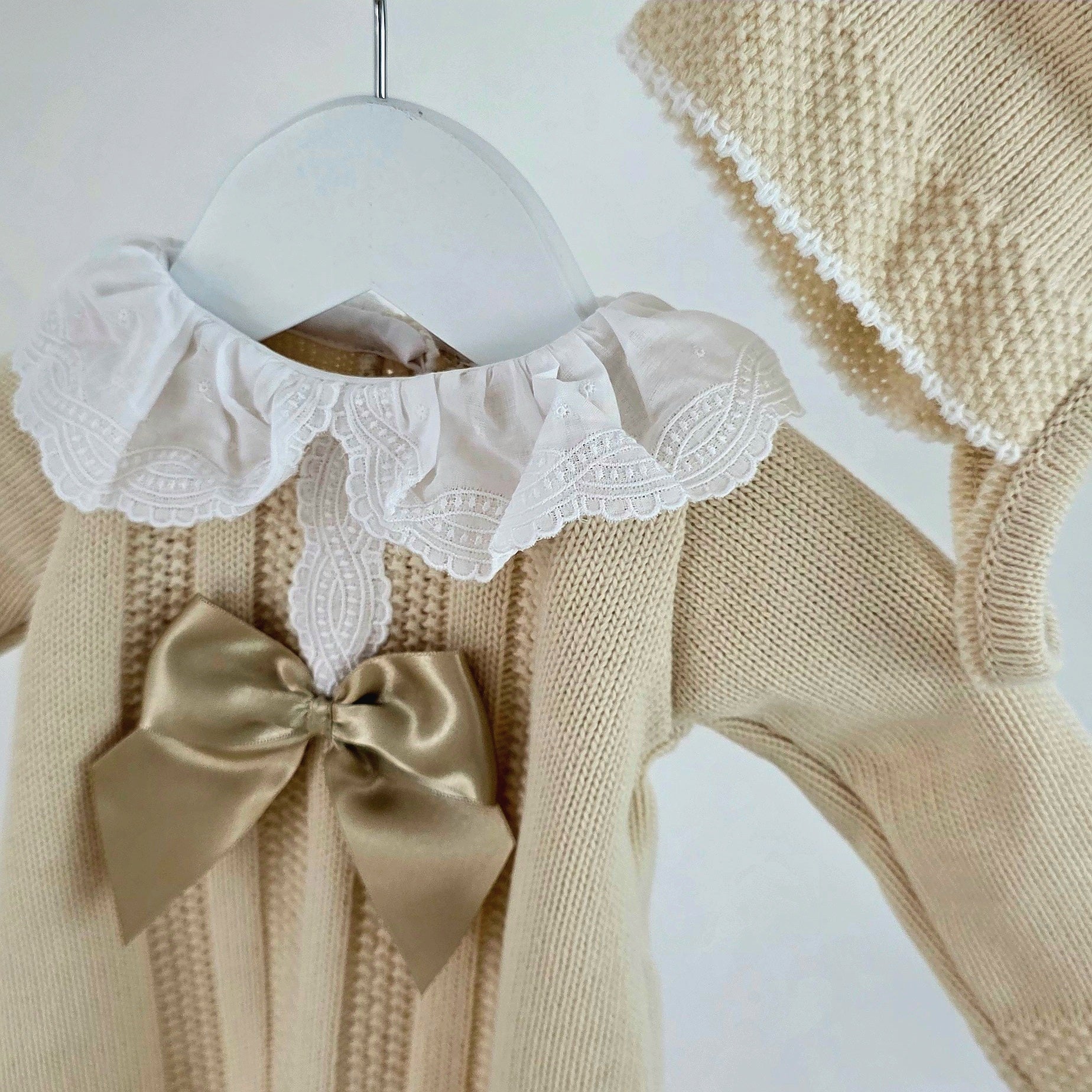 Conjunto encantador de fofo de manga com gorro e laço de cetim à frente