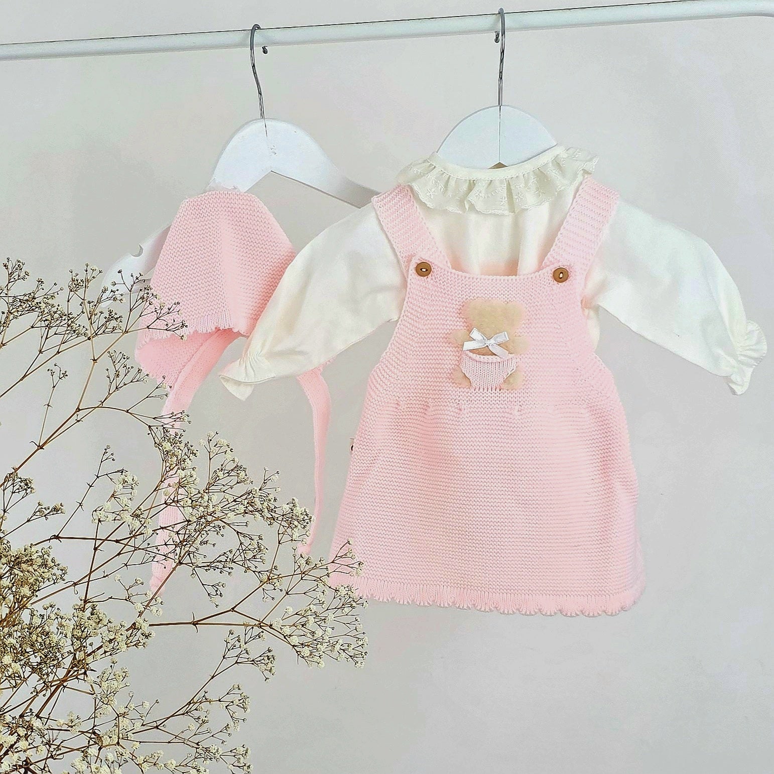 Conjunto: Vestido, Gorro, Camisa abertura atrás